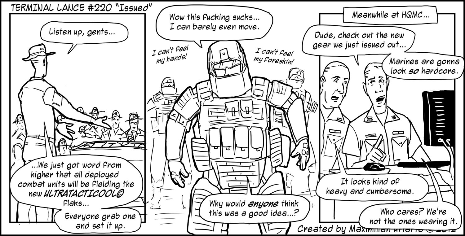 Marines get issued a lot of stupid shit. Sometimes it’s with a genuine effort of protecting you or giving you some kind of tactical edge; other times, it makes you wonder what kind of coked up pipe dream the guys at Quantico think is going on overseas. With very little consideration for how gear will actually behave in the field, a lot of stuff makes it out to the line units that seems incomprehensibly inconvenient and actually makes their job more dangerous by being cumbersome.